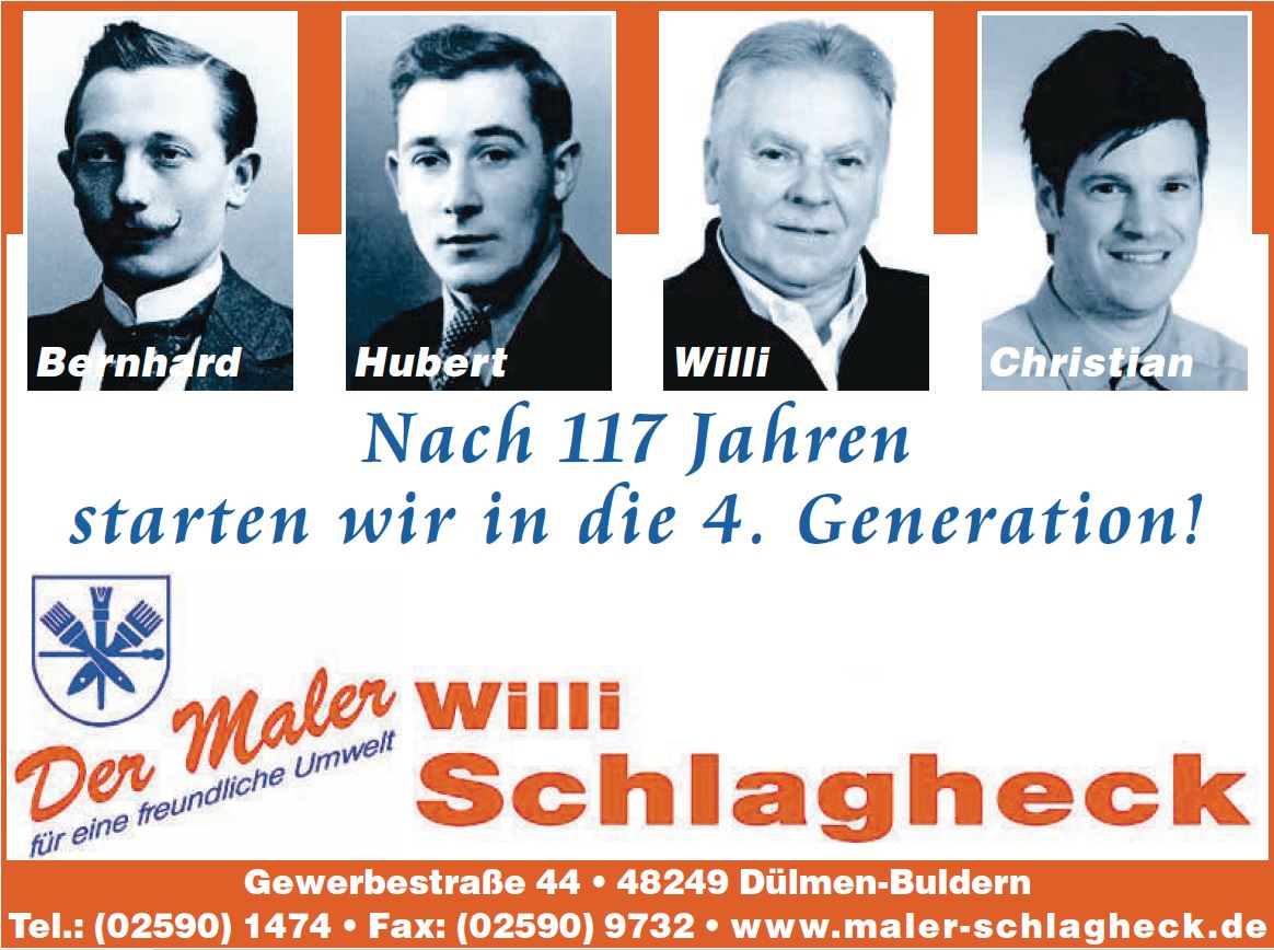 Am 1. April 1900 gründete Bernhard Schlagheck eine, wie es damals hieß, Anstreicherei. Nach dem zweiten Weltkrieg übernahm Hubert Schlagheck den Wiederaufbau der Firma.